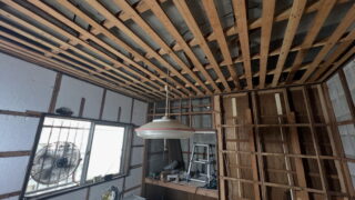 湿気で壁が腐食していたため張替工事を行います。 天井は湿気を吸ってくれるモイスを貼って 屋根裏換気扇を取り付けます。 これで、部屋の湿気対策になります。
